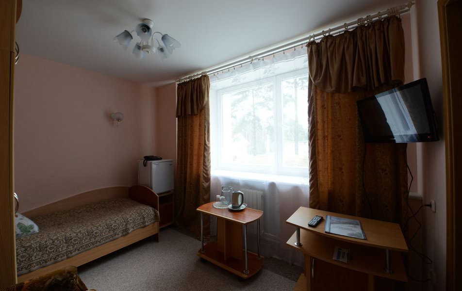 Площадь номера - 11 кв.м. 1 осн. место. Мебель: вешалка, зеркало, кровать односпальная, прикроватная тумбочка, стол, шкаф. Оборудование: набор посуды, телевизор, холодильник, электрочайник. Санузел: с ванной и душевой кабиной, туалетные принадлежности. Сервис: Wi-Fi бесплатно, смена полотенец, смена постельного белья, уборка номера.